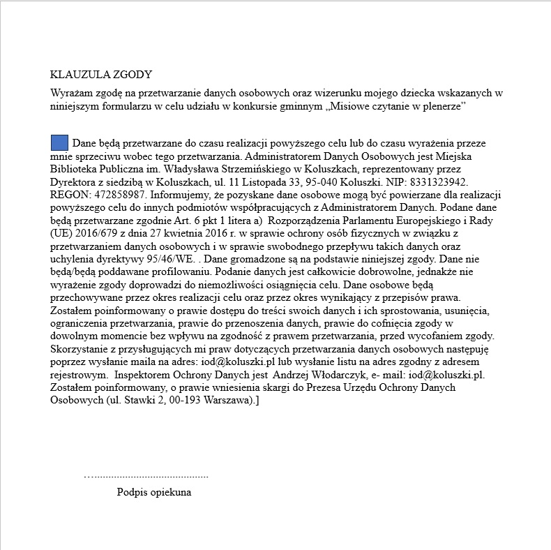 6. Praca powinna zostać dostarczona w postaci pliku elektronicznego w formacie JPG przesłanego na adres mailowy: mbpkoluszki@wikom.pl z dopiskiem: Misiowe czytanie w plenerze, podać imię i nazwisko dziecka, szkoła oraz klasa i telefon kontaktowy.